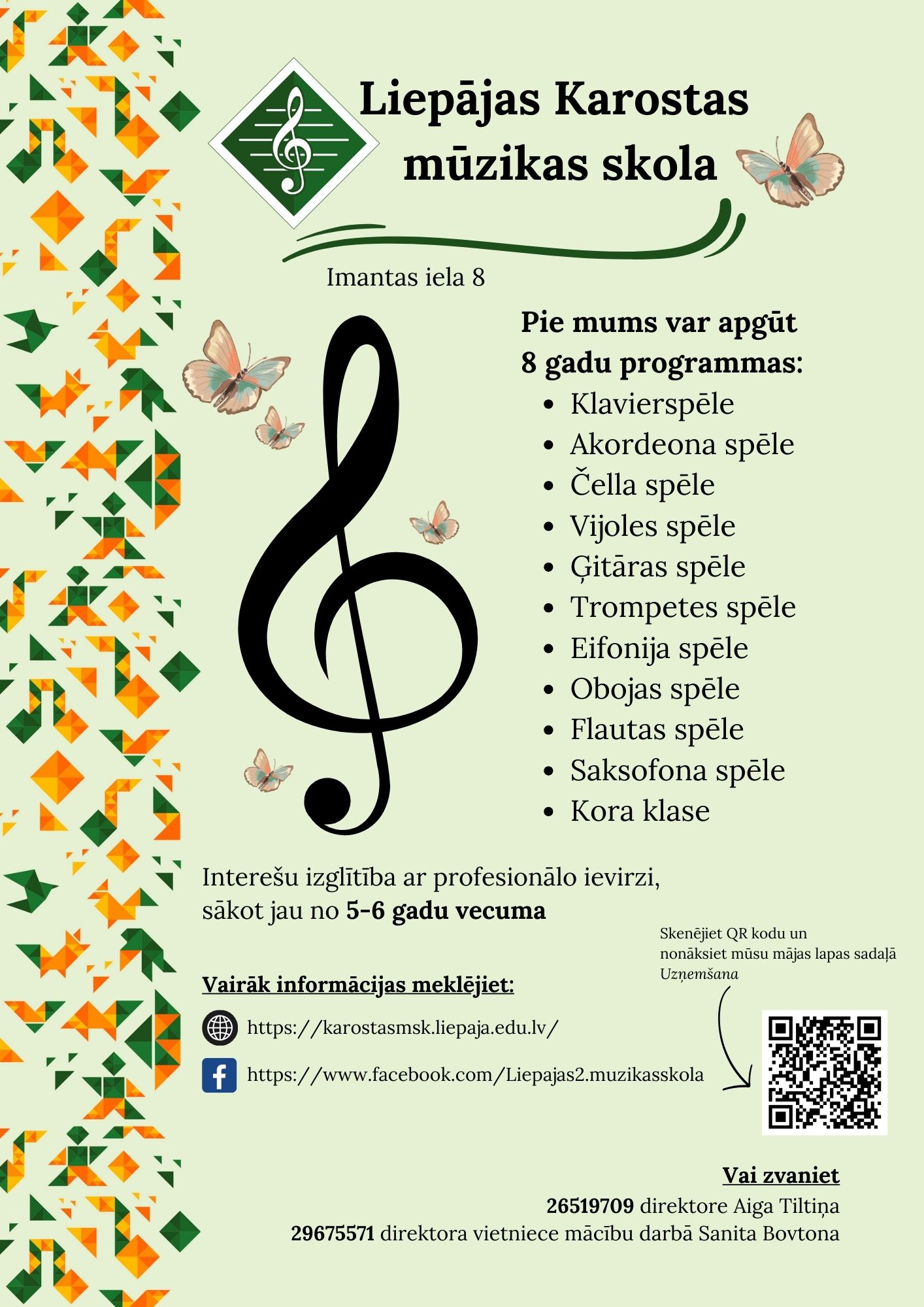Vai aizpildiet audzēkņa uzņemšanas iesniegumu elektroniski Liepājas e-pakalpojumu portālā: https://epakalpojumi.liepaja.lv/lv/projects/?institution=12
